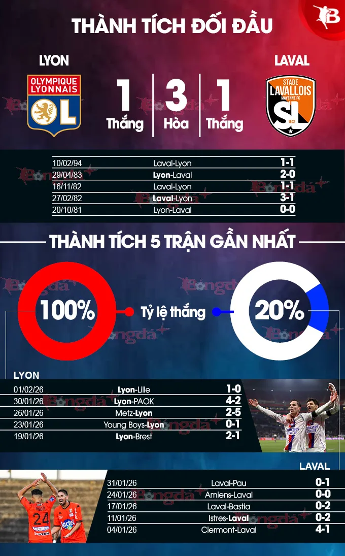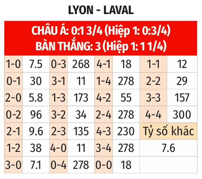 - Lyon Thắng Kèo Châu Á: Chủ nhà đang có chuỗi 8 trận thắng kèo châu Á liên tiếp, trong đó có 5 trận sân nhà. Ngược lại, Laval thua kèo tới 5 trong 7 trận gần đây.