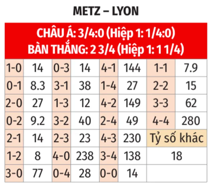 - Trận nhiều bàn thắng: 4/5 lần đối đầu gần nhất, 7/9 trận gần đây của Metz và 4/5 trận vừa qua của Lyon đều chứng kiến từ 3 bàn thắng trở lên. Đây là xu hướng rõ ràng cho một trận cầu mở.