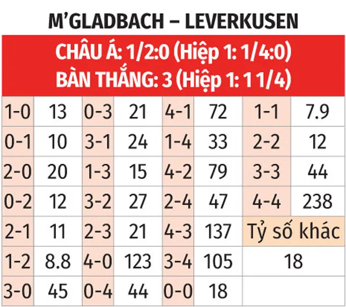 - Tổng bàn thắng Chẵn: Xu hướng chẵn bàn thắng khá rõ với 7/10 trận sân nhà gần nhất của M'Gladbach và 6/8 trận sân khách gần đây của Leverkusen kết thúc với tổng số bàn chia hết cho 2.