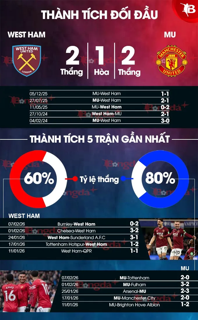 Trong khi đó, West Ham đang vật lộn ở nửa dưới của bảng xếp hạng, với phong độ sân nhà đáng lo ngại. Việc chỉ có được một chiến thắng trong 7 trận gần nhất tại sân nhà khiến họ trở thành đối thủ được đánh giá thấp hơn trước một MU đang lên cao.